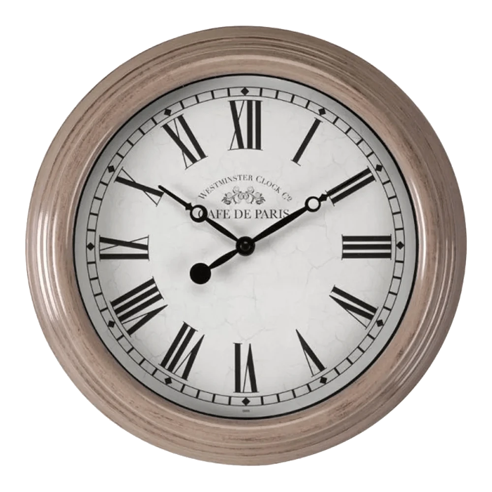 Klassieke klok met grijs verweerde rand en romeinse cijfers. Heeft 1 AA batterij nodig om te werken. 2 jaar garantie.