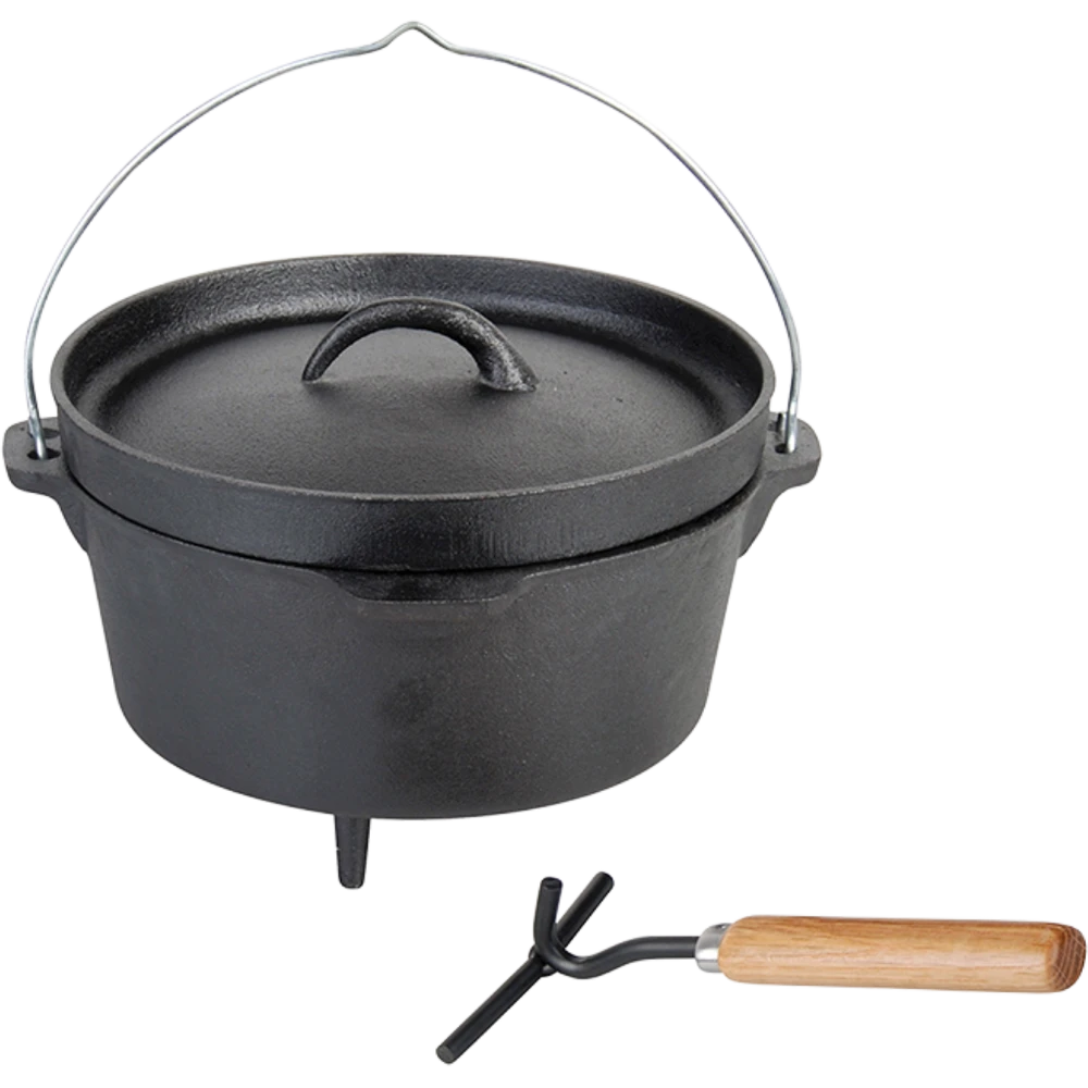 Een kampvuurpot is een traditionele dikwandige kookpot gemaakt van gietijzer, die al vele eeuwen gebruikt wordt. Dankzij het materiaal wordt de warmte gelijkmatig verdeeld over de kookpot en verwarmt het voedsel van alle kanten. Kolen of briketten kunnen eventueel op het deksel geplaatst worden om extra warmte van boven te creëren. Met zijn drie poten staat de kampvuurpot stevig in en op het vuur. Als alternatief kan de pot ook boven het vuur gehangen worden door de draagbeugel die is voorzien van een inkeping voor de ophanghaak. Door middel van de bijgeleverde dekselhaak is het makkelijk om het hete deksel zonder handen af te halen.