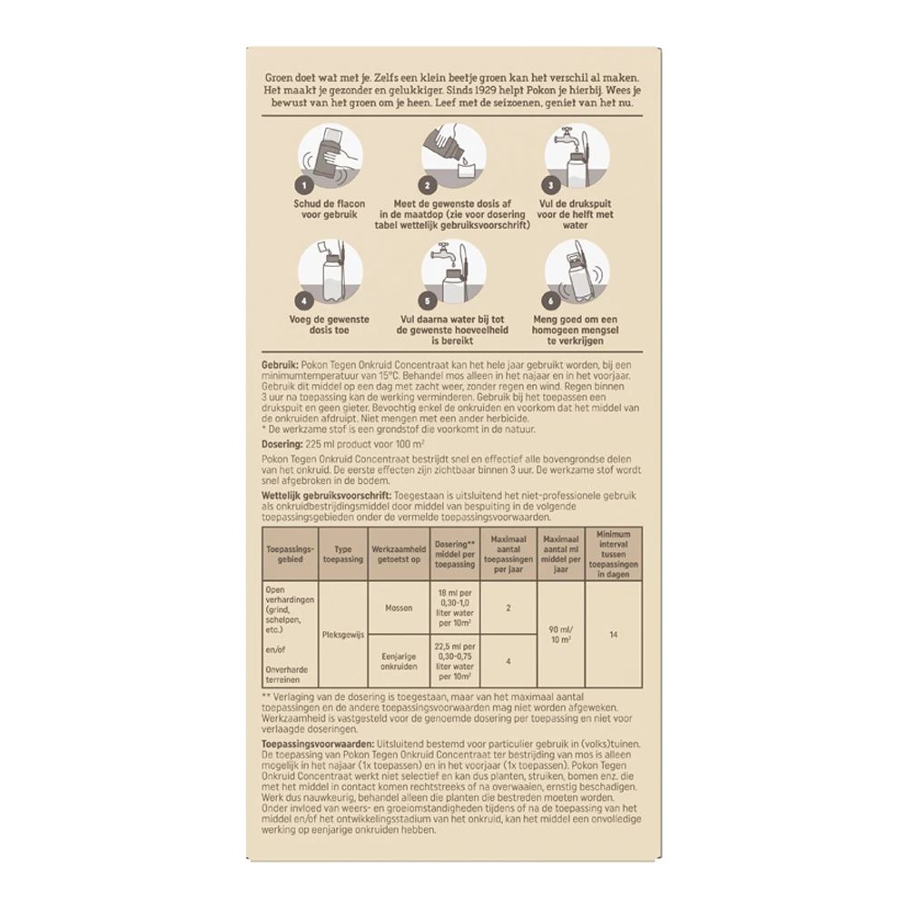 | Dosis | Mossen: 18ml per 0,3-1L water per 10m². Eenjarige onkruiden: 22,5 ml per 0,3-0,75L water per 10m². |