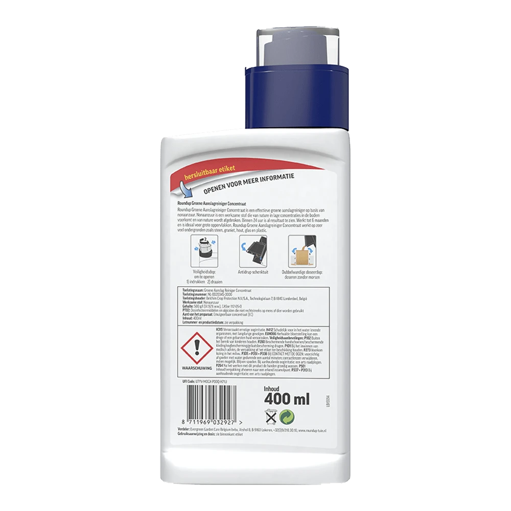ROUNDUP® Groene Aanslagreiniger Concentraat 400ml is een effectieve groene aanslagverwijderaar op basis van nonaanzuur. Nonaanzuur is een werkzame stof die van nature in lage concentraties in de bodem voorkomt en van nature wordt afgebroken. Binnen 24 uur is al resultaat te zien. Werkt tot 6 maanden en is ideaal voor grote oppervlakken. ROUNDUP ® Groene Aanslagreiniger Concentraat werkt op zeer veel ondergronden zoals steen, graniet, hout, glas en plastic.